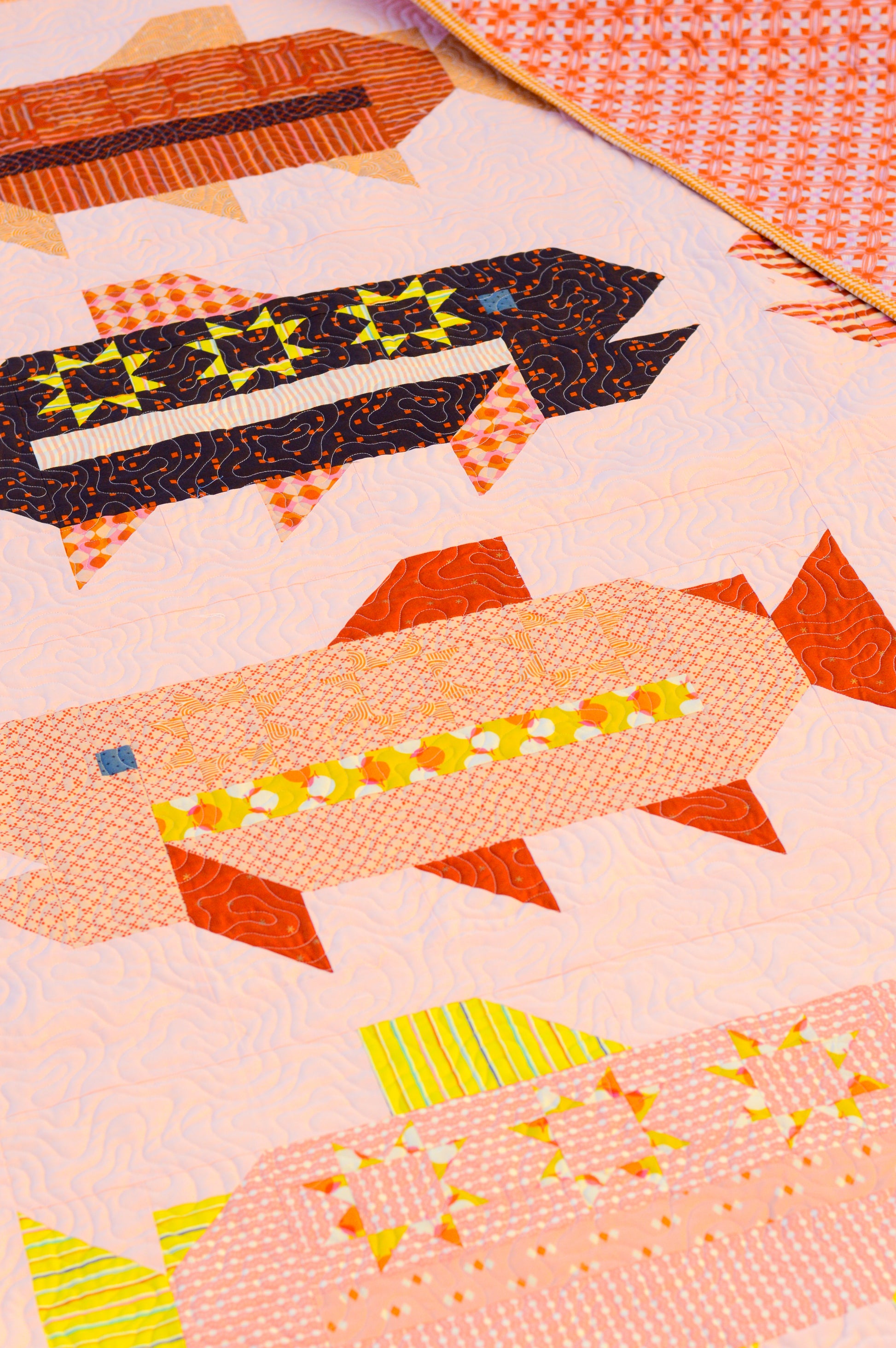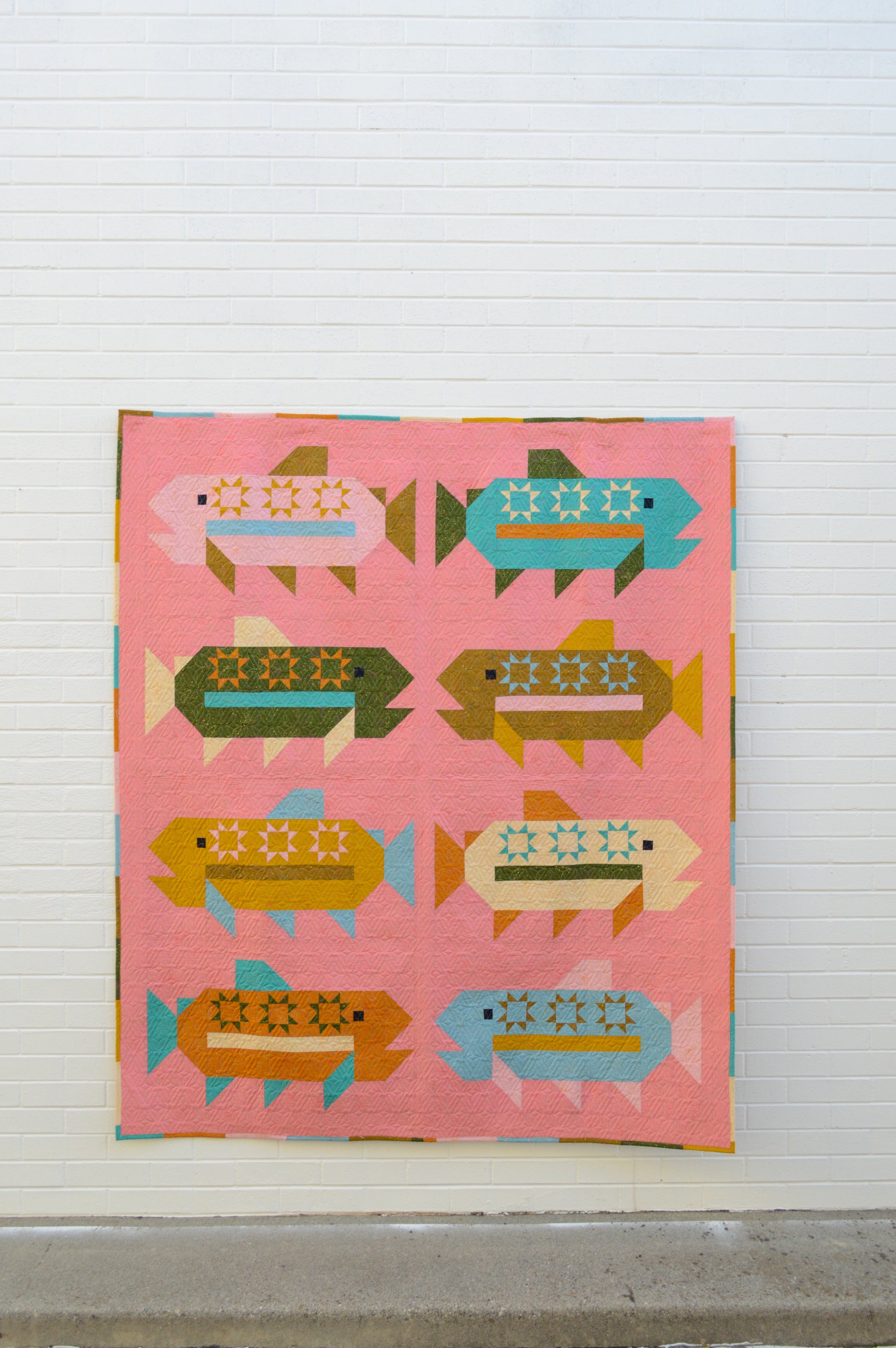 Reel in a new favorite with Fish On! This playful, traditionally pieced quilt features bold, geometric fish blocks that swim across your quilt top. With large pieces and approachable construction, Fish On is perfect for confident beginners ready to dive into techniques like half square triangles, snowballed corners, and flying geese.